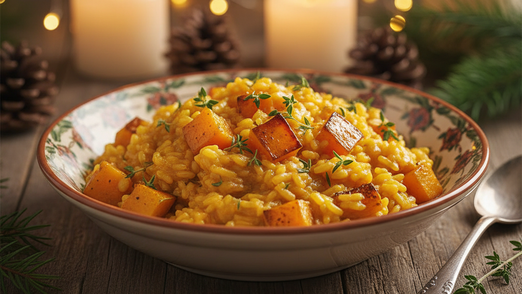 This dish stands out among vegetarian Christmas recipes for its cozy sweetness and golden glow — perfect for a candlelit meal.